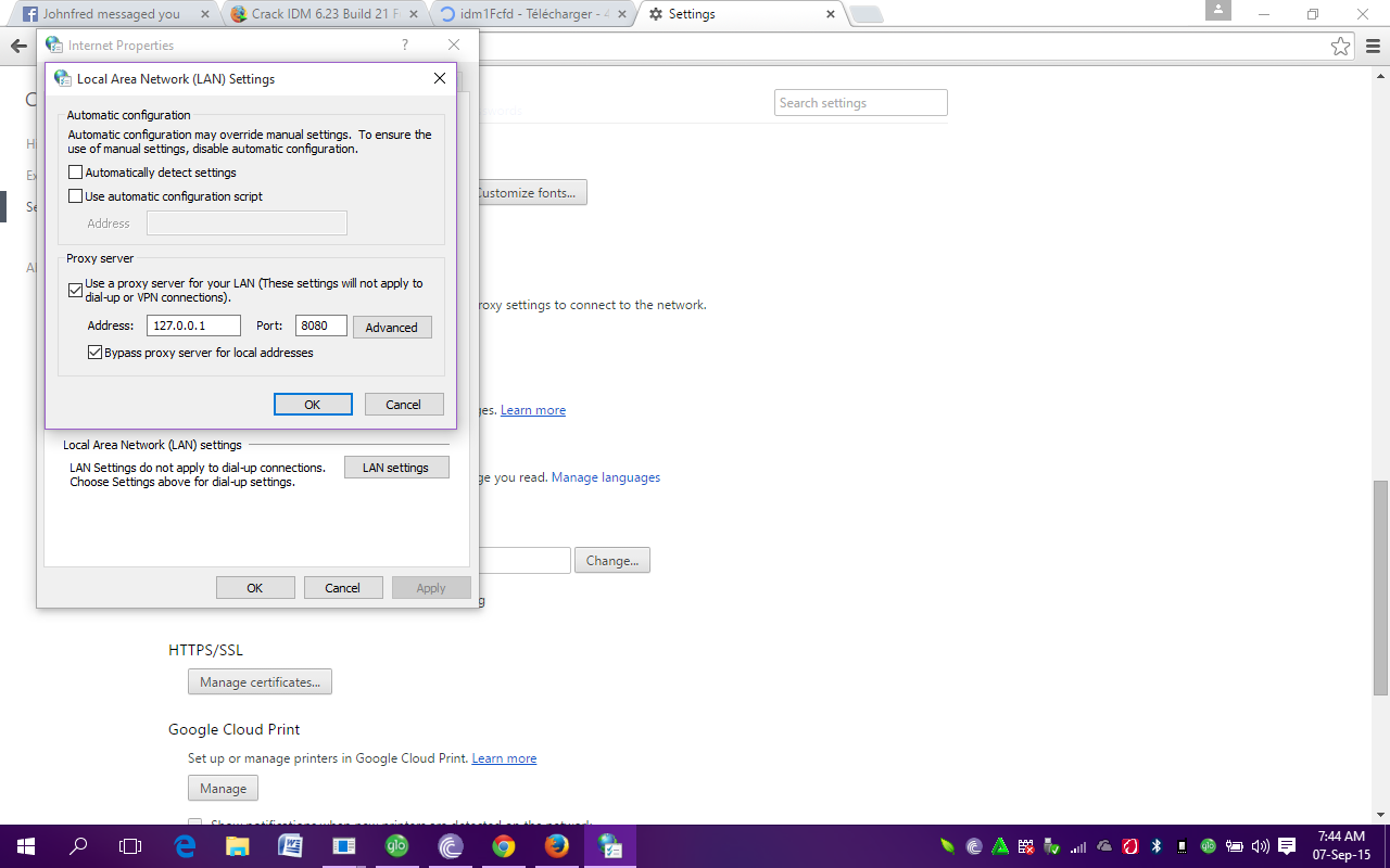 Check bypass proxy servers for local addresses and click OK